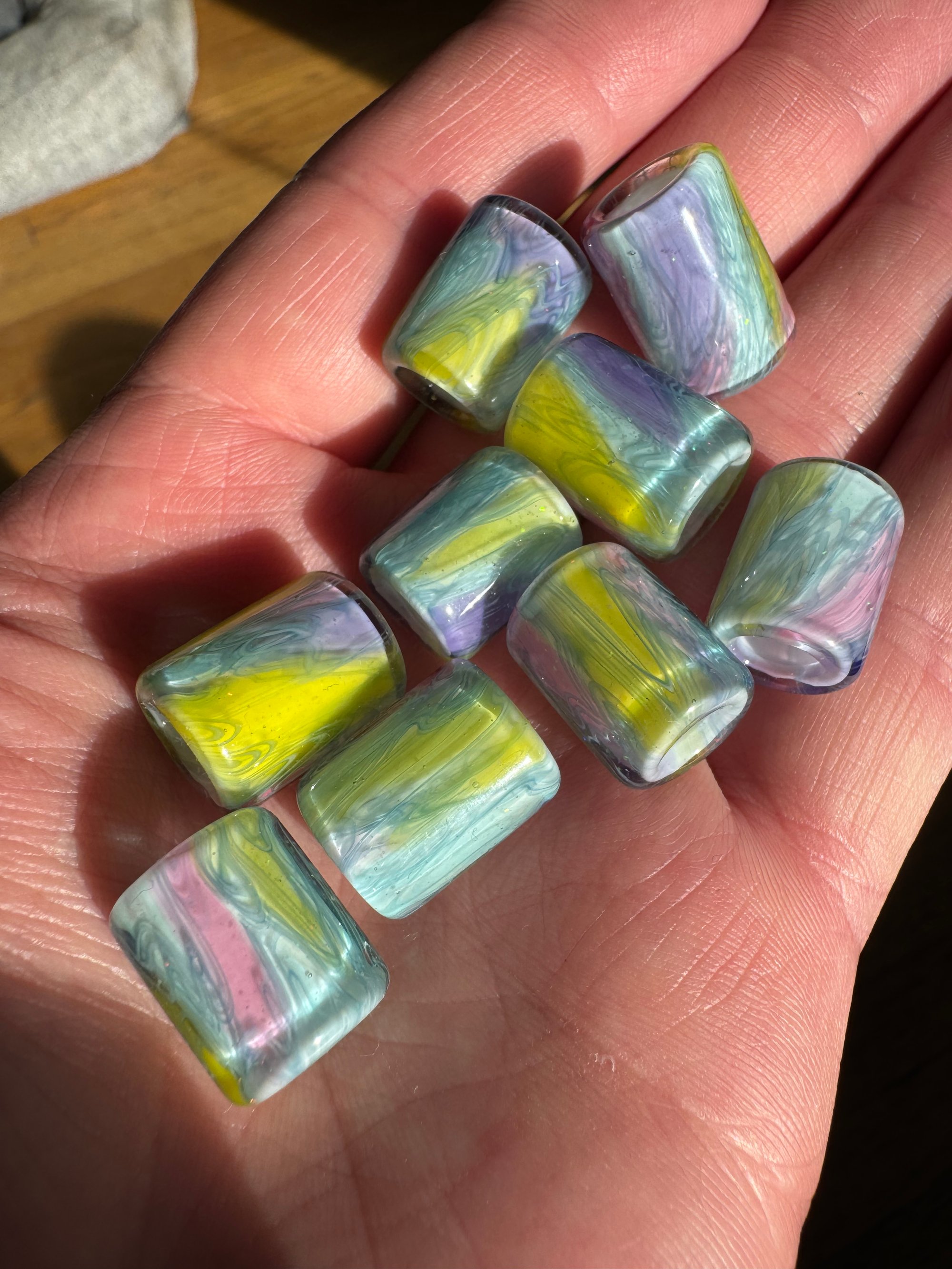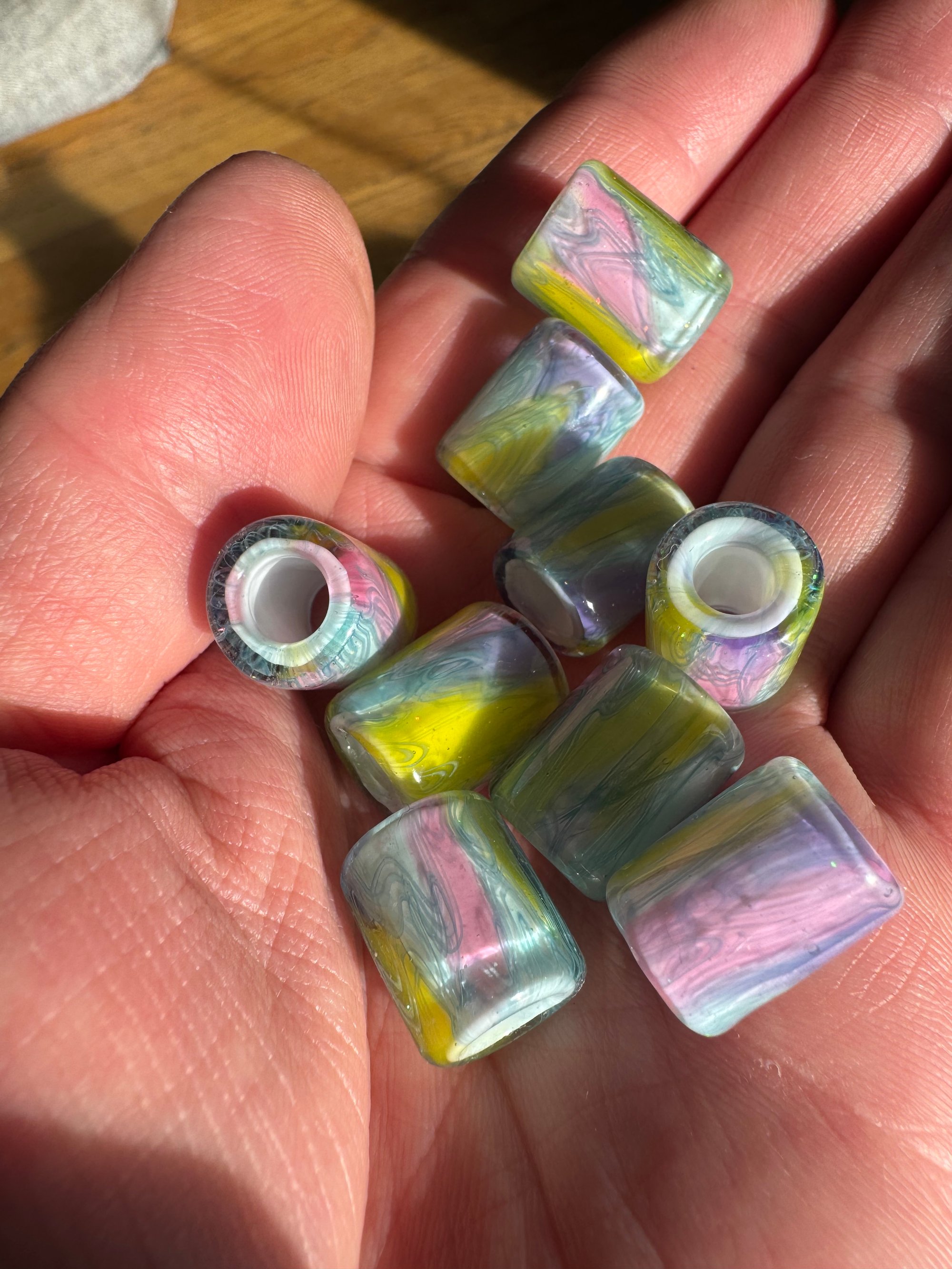 A base layer of lotus coated in layers of twilight over white and uv reactive stingers with swathes of metaterrania, gold ruby, empire, lemondrop, and lime drop. All encased in a bit of crushed opal